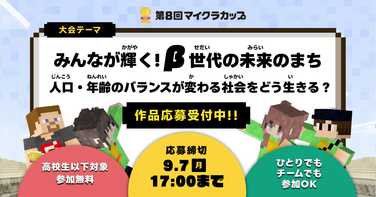 Minecraft Cup is a digital making contest held in Japan for children from elementary to high school. Using Minecraft Education, participants create theme-based works and compete with entries from across Japan and abroad.