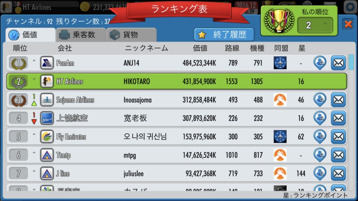 経済危機が発生して、収益が減ります。ここは最初の難関です。弱い会社はここで潰れます。基本的にうまくいけば赤字になることはなく、月15万以上は儲かっているはずです。ちなみにここでいう赤字というのは、減価償却費が総収益を上回っているということです。 もしあなたが赤字でも他のプレイヤーはもっと酷いので、きっと放置するだけで順位が上がっていくでしょう。余裕があれば月1機のペースで DC-10-30F を買います。経済レベルが落ちているので儲かりませんが、逆に言えばここが路線開拓のチャンスです。